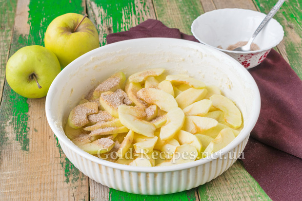 Викладемо в неї часточки яблук. Змішаємо одну столову ложку цукру з меленою корицею, посиплемо отриманою сумішшю фрукти.