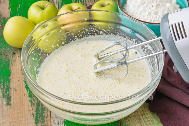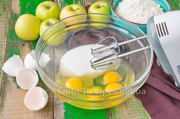 Яйця розбиваємо в глибоку піалу. Додамо до них цукор, залишивши одну столову ложку для посипання фруктів.