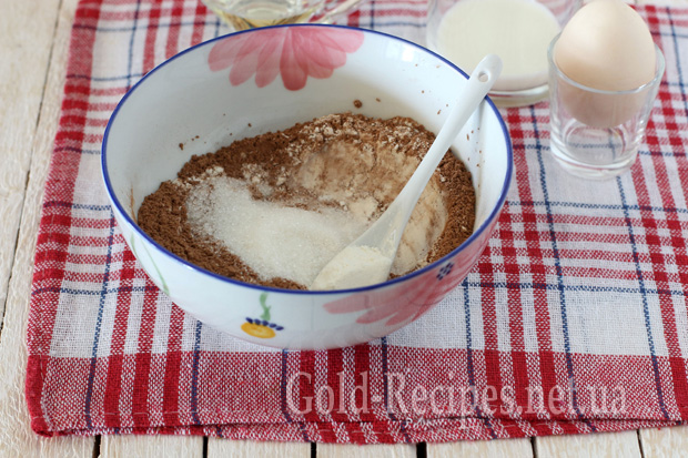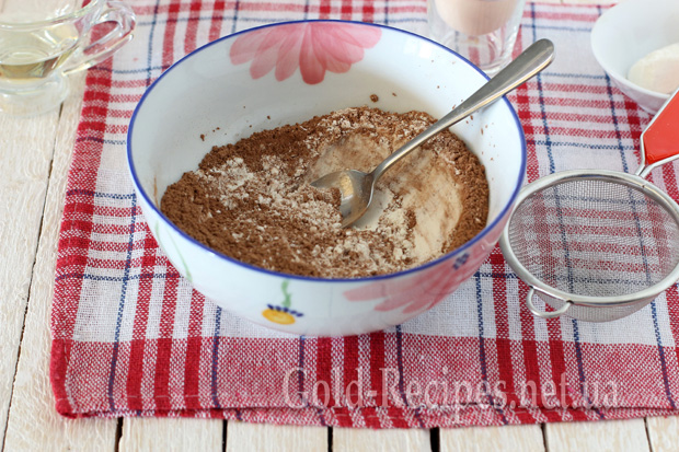 Для початку беремося за сипучі продукти – змішуємо порошок какао, борошно і цукор. Какао і борошно я просіюю через сито, щоб надалі було простіше вимісити тісто без грудок.