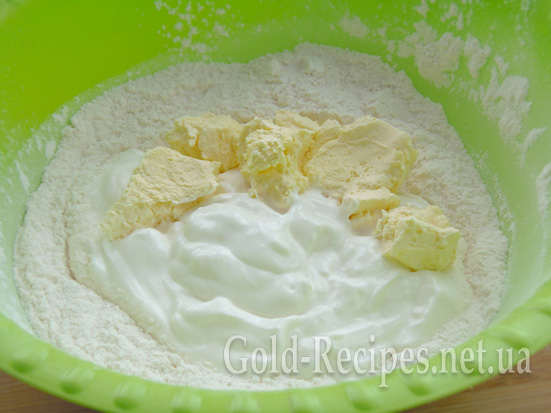 Формуємо в суміші сухих інгредієнтів заглиблення, додаємо в нього сметану (у мене 15%) і м’яке вершкове масло.