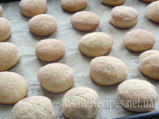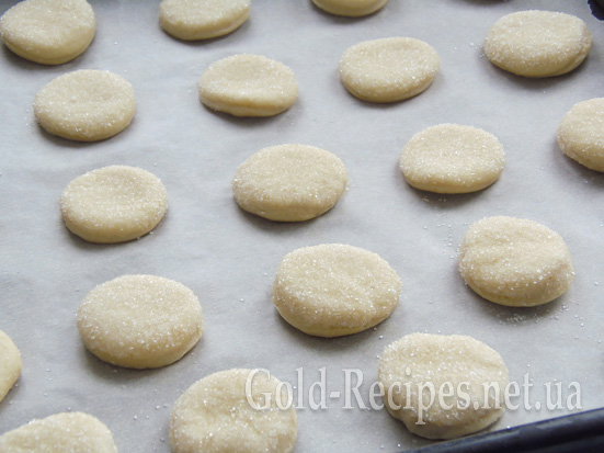 Один бік отриманих заготовок занурюємо в цукор і викладаємо печиво на деко, застелене папером, цукровим боком догори.