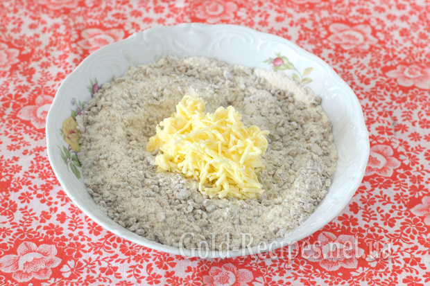На останньому етапі приготування крихти натираємо шматочок холодного масла (ось тут принципово важливо взяти дуже (!) холодний шматочок масла) на дрібній тертці.