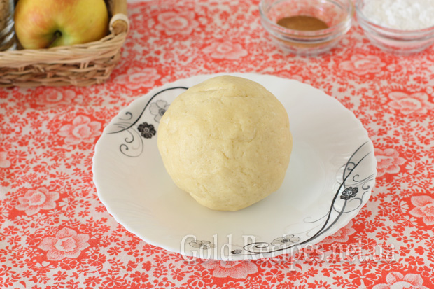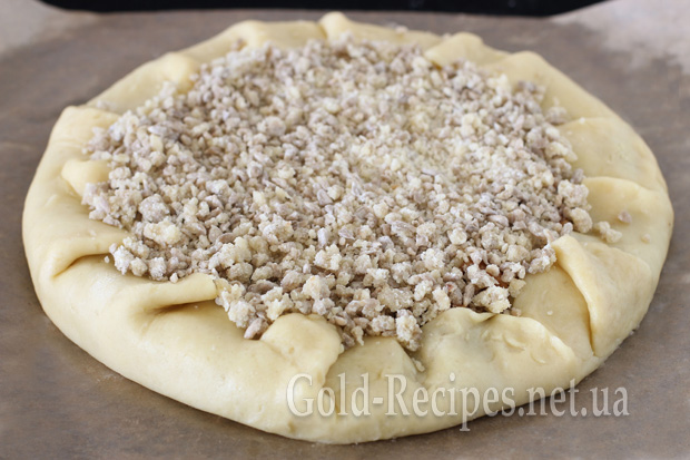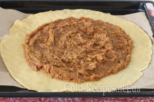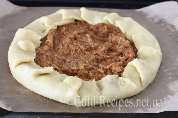 Дістаємо пісочне тісто, розгортаємо в пласт із невеликою товщиною в 5-7 мм, у центр викладаємо яблучну начинку.