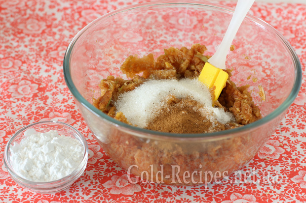 Змішуємо терті яблука з цукром (вони потемніють, але це не страшно), порціями всипаємо крохмаль (картопляний підійде так само, як і кукурудзяний). Ароматизуємо начинку з яблук столовою ложкою меленої кориці.