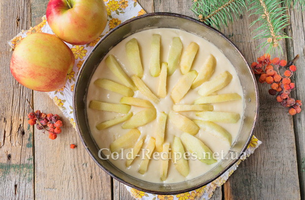 Яблука помиємо, очистимо від шкірки, виріжемо серцевину. Поріжемо фрукти на скибочки. Рівномірно розподілимо яблука по поверхні пирога, трохи втоплюючи їх у тісто.