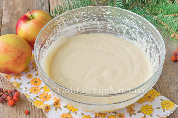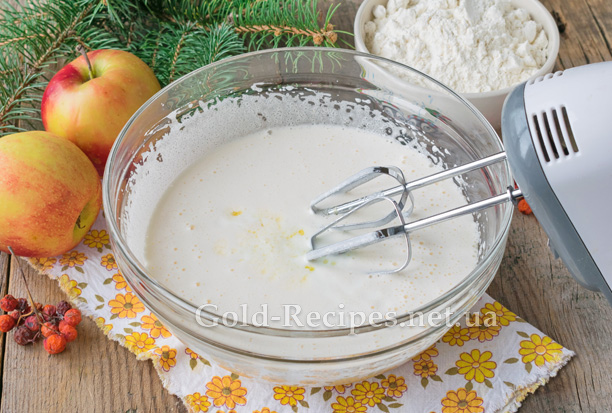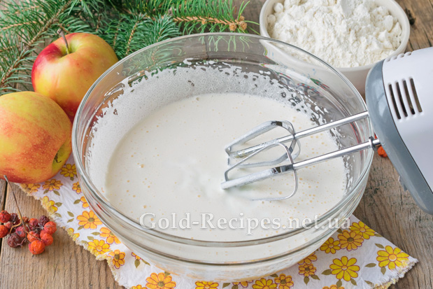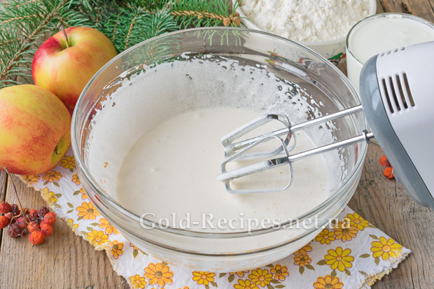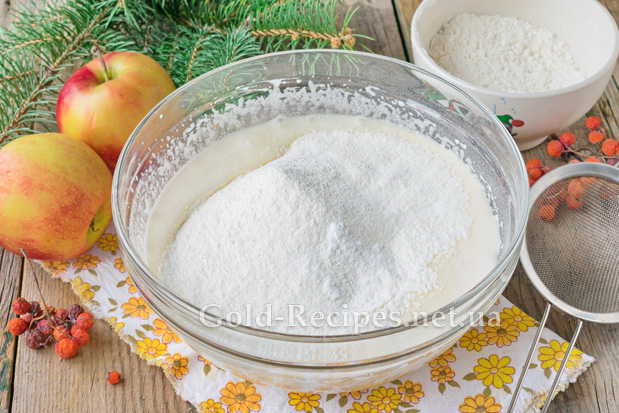 У кілька прийомів введемо в тісто на кефірі для пирога з яблуками просіяне борошно вищого ґатунку.