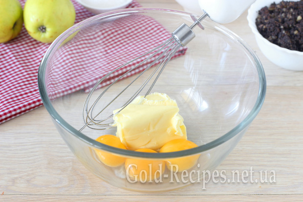 Приступаємо до приготування яблучної основи. Для неї збиваємо м’яке вершкове масло з 3 жовтками (білки відкладіть у чистий і знежирений посуд).