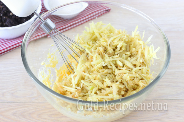До вершкової збитої маси всипаємо дрібно натерту яблучну м’якоть (без шкірки), акуратно перемішуємо.