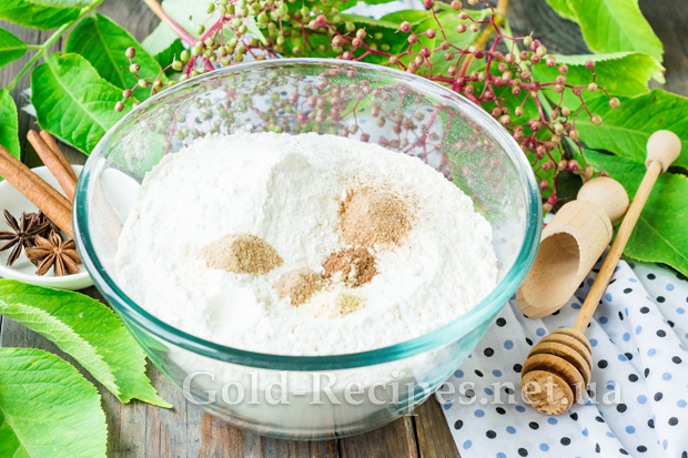В окремому посуді з’єднаємо решту просіяного борошна, розпушувач, дрібку солі та мелені прянощі. За допомогою вінчика перемішаємо суху суміш до однорідності.