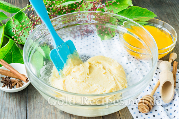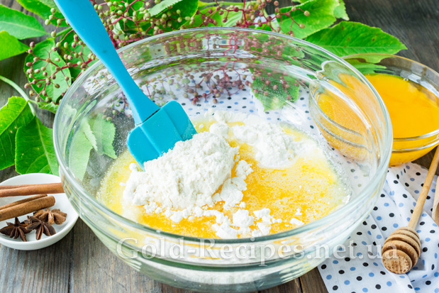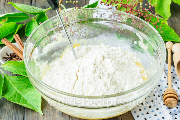 Додамо отриману суху суміш у заварне тісто з медом.