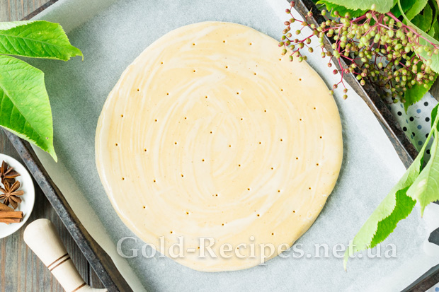 Викладемо заготовку на деко, застелене пергаментним папером. Використовуючи кулінарний пензлик, змастимо заготовку холодною водою. Наколем тісто дерев’яною зубочисткою, щоб воно не деформувалося в процесі випікання.