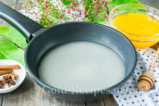 У посуді з товстим дном з’єднаємо 40 г цукру та 15 мл води. Нагріємо суміш до температури 110 градусів.