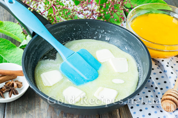 Коли цукор повністю розчиниться, додамо в сироп шматочки вершкового масла. Перемішаємо суміш, щоб масло повністю розтануло і з’єдналося з іншими інгредієнтами.