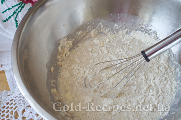 Спочатку приготуємо опару традиційним способом. Підігріваємо молоко, додаємо дріжджі, 2 ст. ложки цукру і 2 ст. л муки. Все перемішуємо вінчиком, накриваємо серветкою і ставимо в тепле місце на 20-30 хвилин.