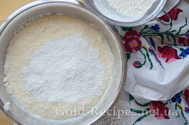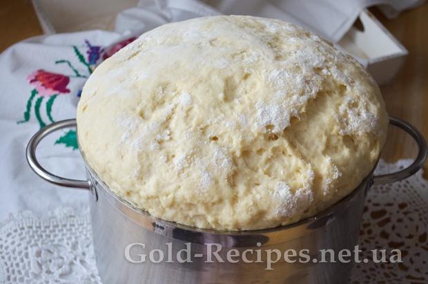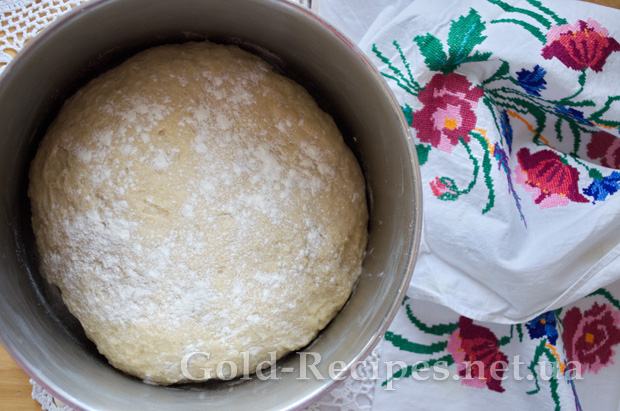 Вмішуємо олію в тісто, додаємо ще муки, щоб гарно замісити. Потім перекладаємо тісто назад в каструлю і відправляємо друге вистоювання в тепле місце на 2-2,5 години.