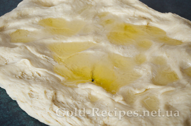 Дістаємо його з каструлі, викладаємо на стіл, і розтягуємо. Потім наливаємо поверх тіста олію.