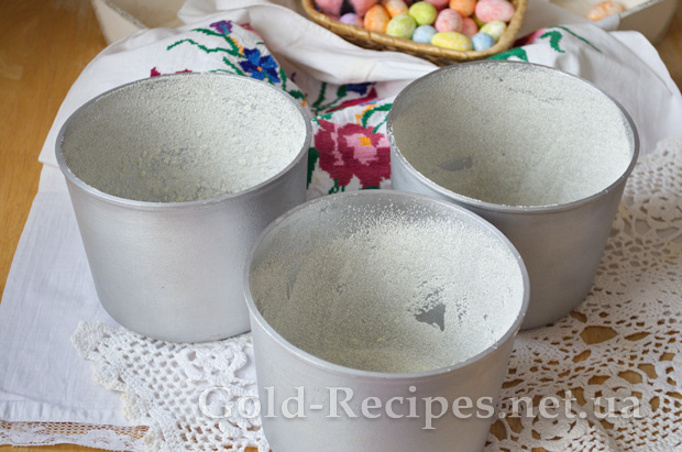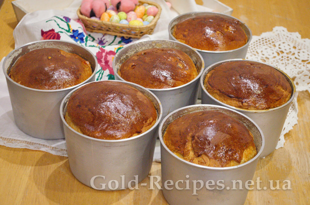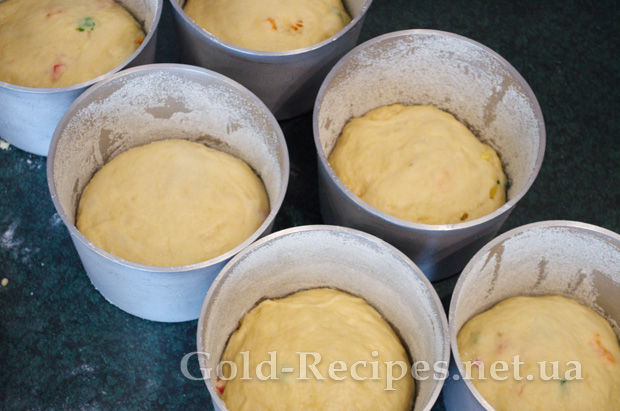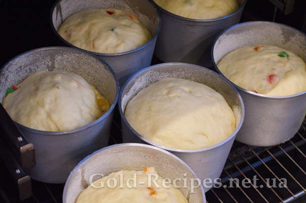 Коли тісто в формах підросте в 2 рази, можна вже випікати наші паски. Ставимо їх на в духовку на саме нижнє положення решітки і вмикаємо духовку на 180 град. нижній і верхній нагрів. Через 20 хв. потрібно змастити верхівки пасок збитим жовтком.