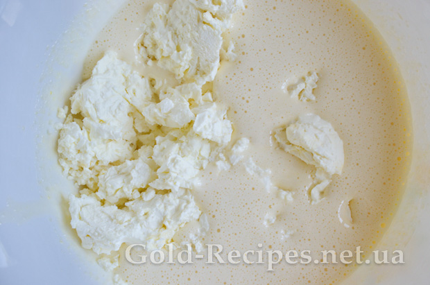 Додаємо в яєчно-цукрову суміш сир, перемішуємо ложкою.