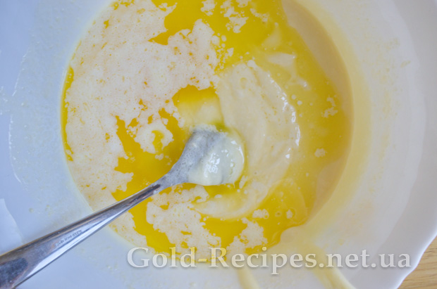 Далі додаємо в тісто розтоплене вершкове масло і перемішуємо ложкою.