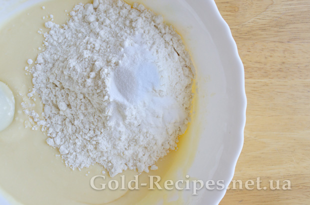 Тепер додаємо борошно і розпушувач, і ретельно вимішуємо. Має вийти густе, сирне тісто, в якому “стоїть ложка”.