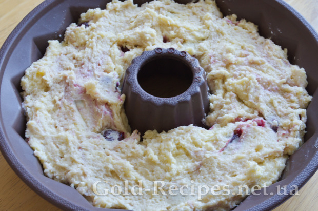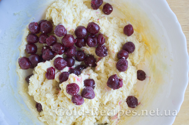 На цьому етапі додаємо до тіста вишню, і акуратно перемішуємо, щоб ягоди рівномірно розподілилися по тісту.