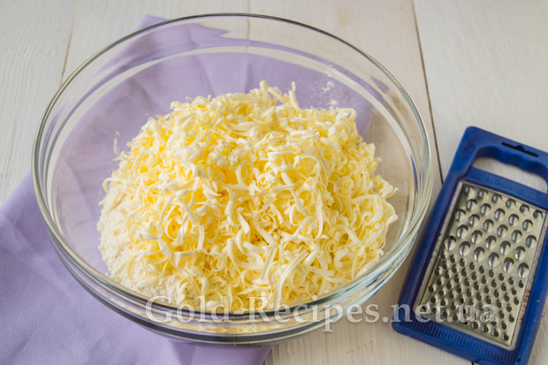 Холодний маргарин натремо на крупній тертці. Маргарин набагато легше терти, якщо періодично опускати його в борошно, щоб він не приставав до терки.