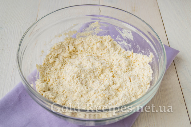 Потім швидко перетремо борошно з подрібненим маргарином руками, щоб у результаті вийшла дрібна крихта.