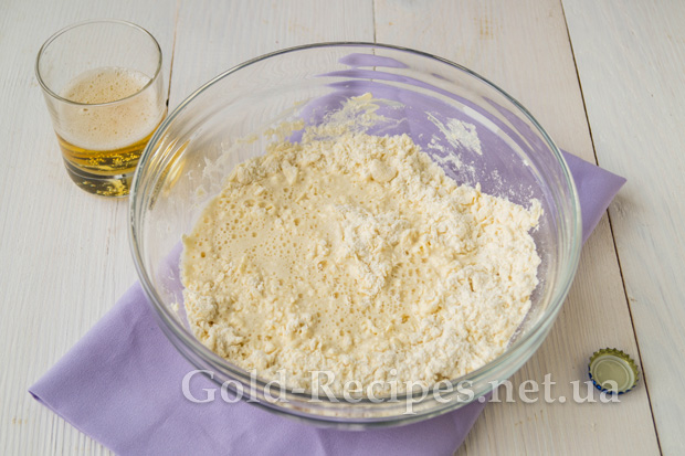 Потім наллємо в отриману суміш пиво. Сорт не має особливого значення, тому можна приготувати таке печиво на темному пиві.
