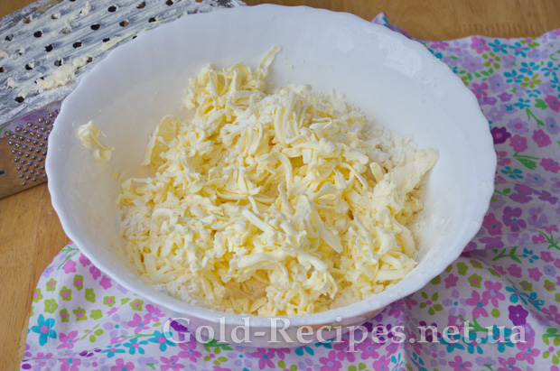 Охолоджене вершкове масло натираємо на крупну тертку, і додаємо дві склянки борошна.