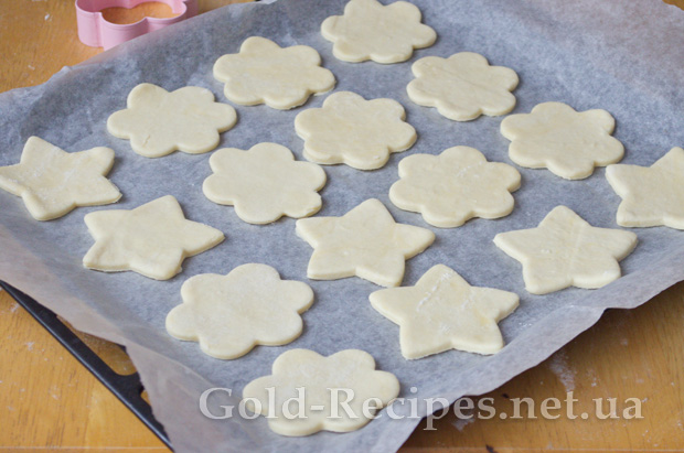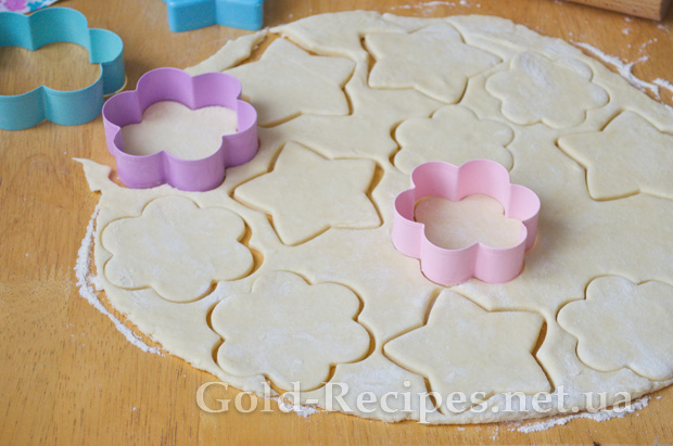 За допомогою формочок, або склянки видавлюємо печиво. Слід зазначити, що для цього листкового тіста нам знадобляться досить великі формочки – щонайменше 7-8 см. у діаметрі, без дрібних елементів.