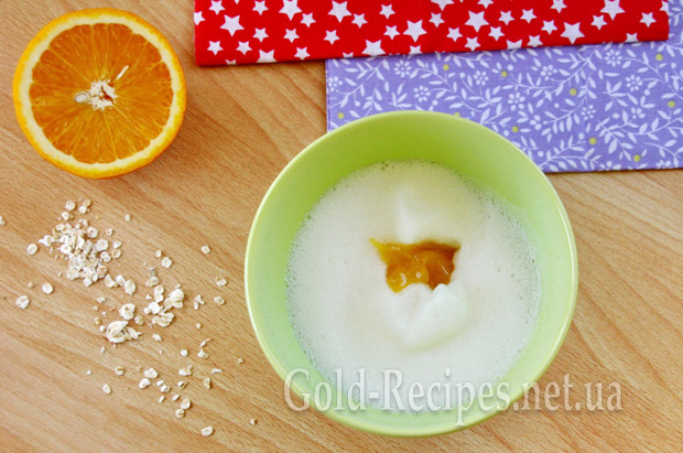 У зручну для роботи міксером ємкість наливаємо олію, кладемо білки з медом, апельсинову цедру, а також розпушувач. Перемішуємо.