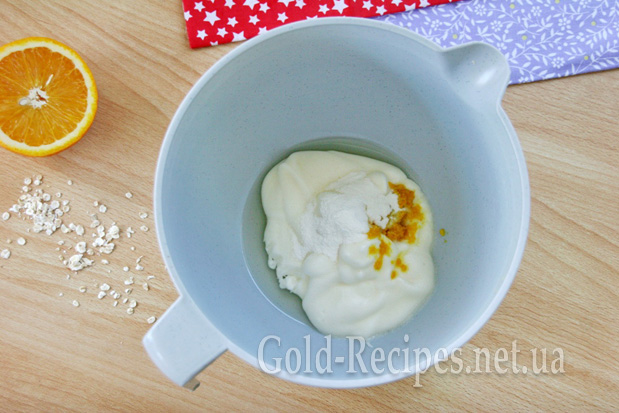 Кладемо вівсяні пластівці, замочені в кефірі, ретельно перемішуємо.