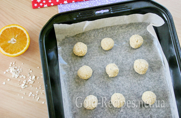 Руками, змоченими у воді, відщипуємо невеликі шматочки тіста, формуємо з них кульки розміром із волоський горіх. Кульки викладаємо на деко на відстані приблизно 3 см одна від одної.