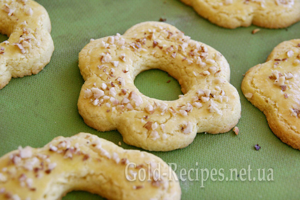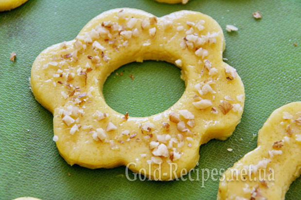 Обережно перекладаємо печиво на деко. Злегка збиваємо жовток із половиною чайної ложки води. Цією масою змащуємо печиво та посипаємо горіхами.
