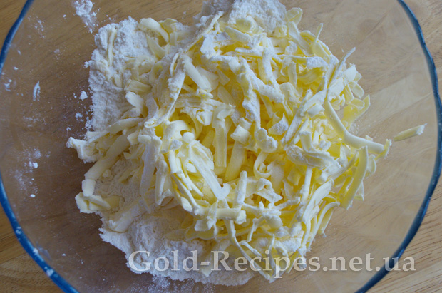 Половину борошна насипаємо у велику миску, і натираємо холодне вершкове масло на крупну тертку.