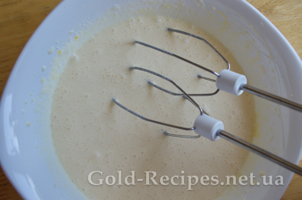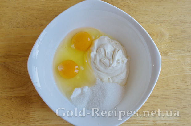 В окремій глибокій тарілці з’єднуємо яйця, цукор і сметану.