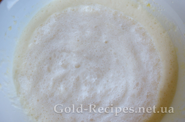Додаємо в цукрово-яєчну суміш соду, гашену оцтом, і перемішуємо.