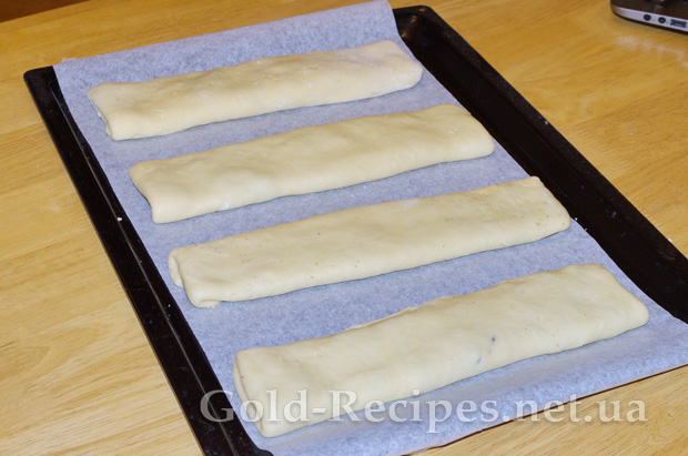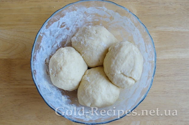 Розділяємо тісто на 4 однакові частини, і приступаємо до “складання рулетиків”.