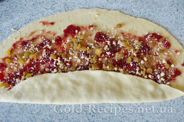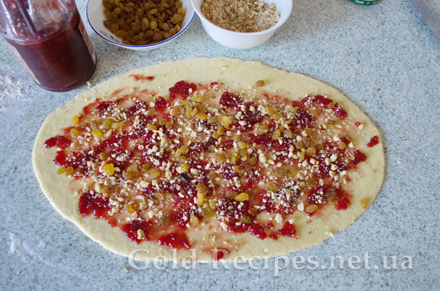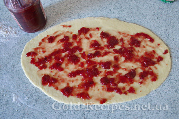 Намазуємо по всьому пласту тіста джем, відступаючи від країв. На одну частину тіста йде приблизно 2 ст.л. джему.