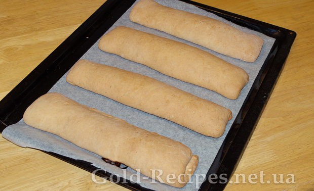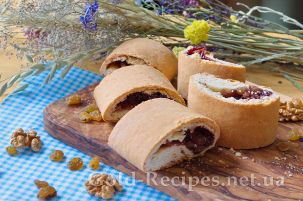 Викладаємо готові рулети з начинкою на деко швом донизу, попередньо застеливши папером для випічки, і відправляємо в розігріту до 180 градусів духовку на 45 хвилин.