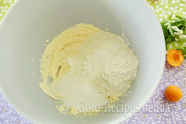 Борошно просіваємо. До масла зі сметаною насипаємо борошно, цукор і розпушувач.