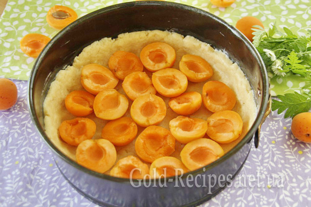 Абрикоси розрізаємо навпіл по борозенці та видаляємо кісточки. Розкладаємо абрикоси зрізом догори або вниз – на ваш розсуд – поверхнею тіста.