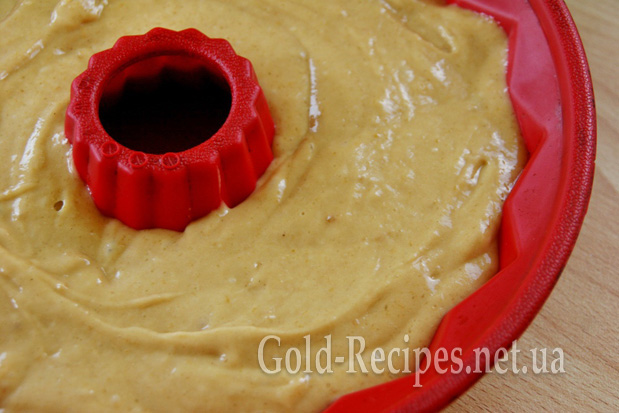 Вид форми може бути будь-який (кругла, квадратна, прямокутна форма – неважливо). Акуратно розрівнюємо поверхню тіста ложкою. Кекс виростає дуже добре, тому необхідно, щоб він доходив приблизно до середини форми, або трішки вище.