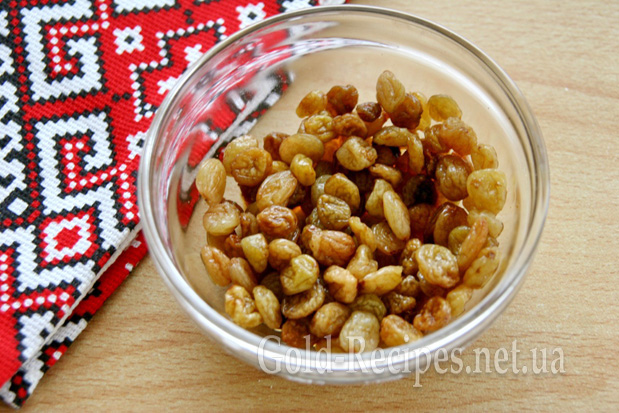 Ізюм промиваємо і заливаємо невеликою кількістю окропу. Через 10 хвилин воду зливаємо і додаємо до родзинок коньяк. Залишаємо так родзинки на півгодини.