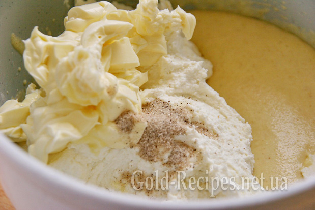 Через 20-30 хвилин з того моменту, як ми додали манку в цукрово-яєчну суміш. З’єднуємо її з сиром і ванільним цукром. Додаємо розм’якшене вершкове масло.