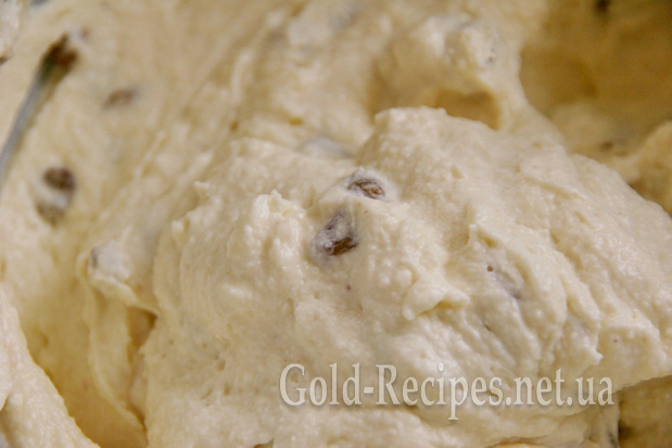 Потім додаємо родзинки, вимочені в коньяку, і знову все перемішуємо. Неодмінно пробуємо масу – чи достатньо вона солодка. За потреби додаємо ще трохи цукрової пудри.