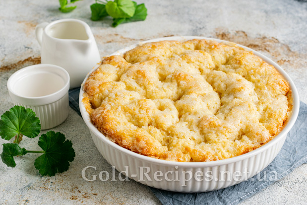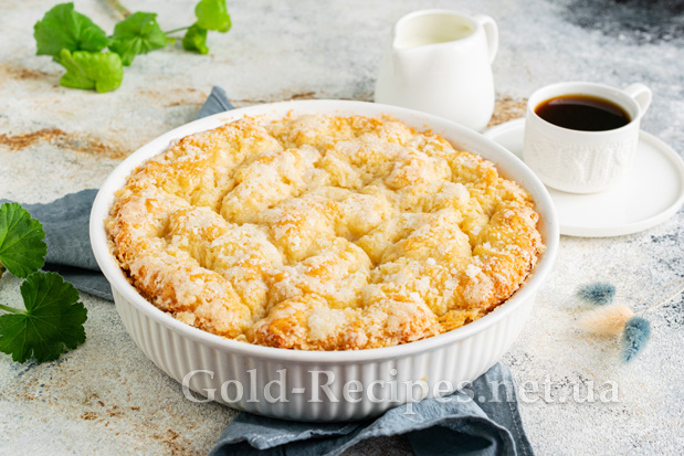 Зверху рівномірно розподіляємо штрейзельну крихту. Відправляємо пиріг у розігріту до 180 градусів духовку на 25-30 хвилин.