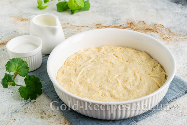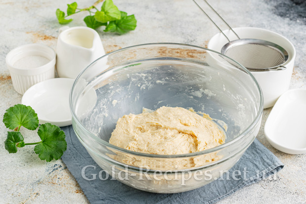За допомогою столової ложки замішуємо дуже м’яке та липке тісто. Накриваємо піалу з тістом харчовою плівкою або сухим рушником, залишаємо тісто для вистоювання в теплому місці на 1 годину.