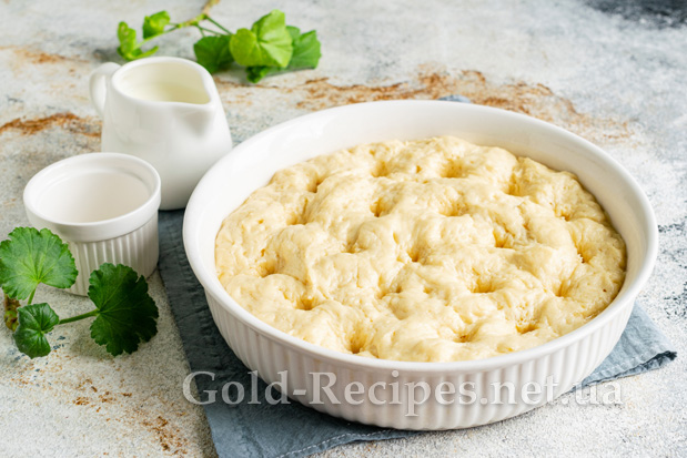 Накриваємо форму для випікання харчовою плівкою або рушником, залишаємо тісто для вистоювання в теплому місці на 30 хвилин.