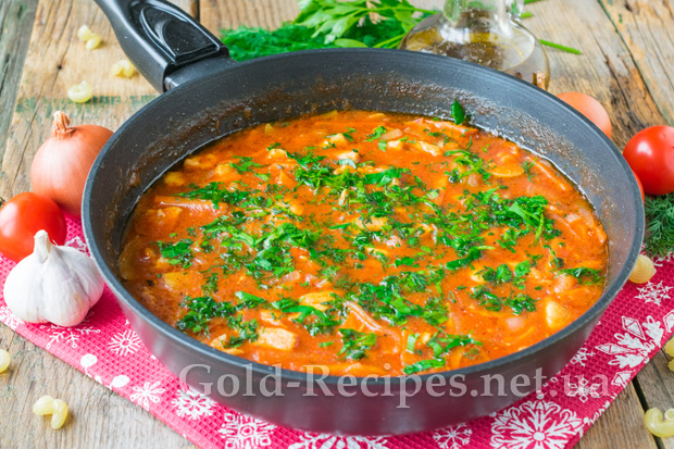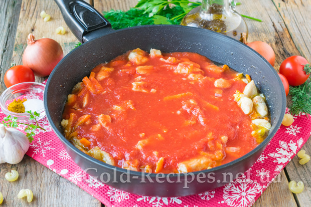 Тепер заллємо суміш із курячого філе та овочів томатним соком. Помішуючи, будемо тушкувати підливу з курки з овочами на повільному вогні 10-15 хвилин.